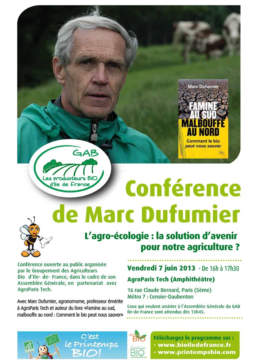 Marc Dufumier sera dans une une conférence ouverte au public, à l’initiative du Groupement des Agriculteurs Bio d’Ile de France, vendredi 7 juin de 16h à 17h 30 à Paris…