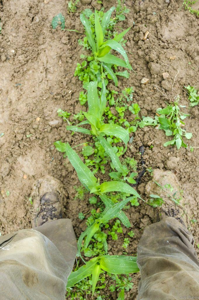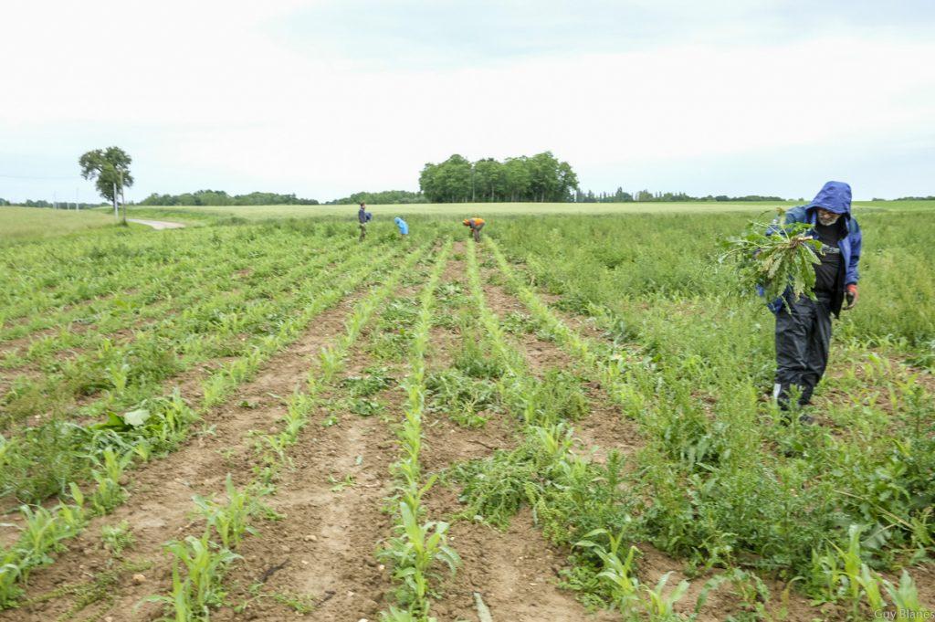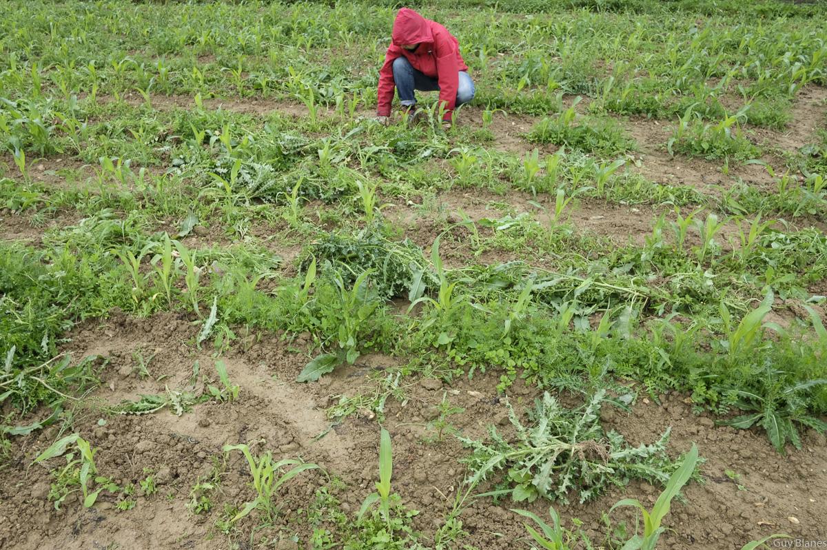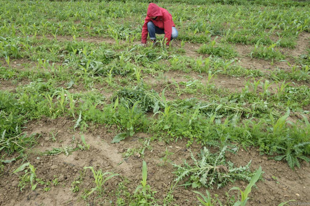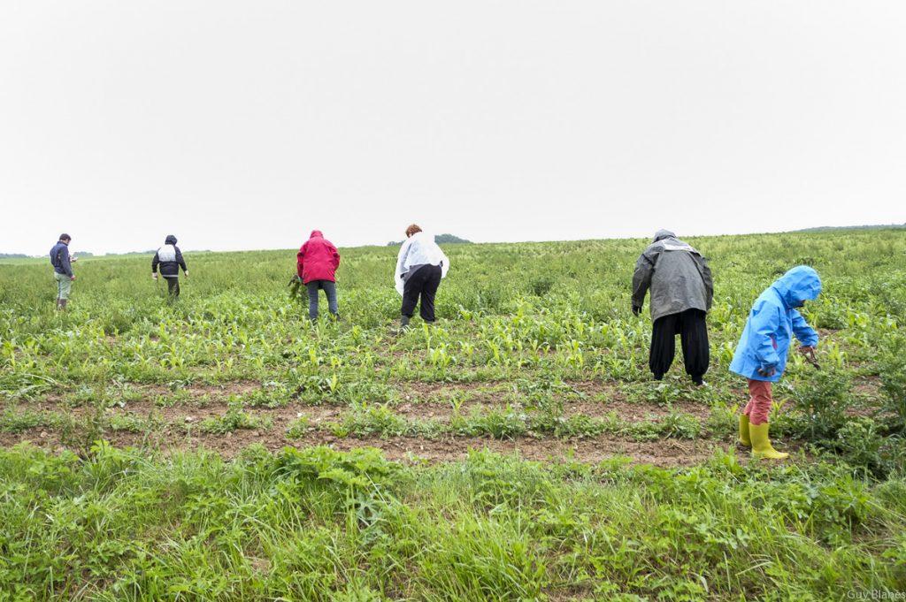 En convoi nous avons suivi la camionnette jaune pour se rendre quelques kilomètres de la ferme. Plus d’une dizaine d’amapien(e)s, beaucoup d’amaps parisiennes dont certains venus camper se sont retrouvés dans cette parcelle plantée de maIs mais envahie par des adventices très hautes et certaines profondément enracinées. Le désherbage avait commencé la veille.