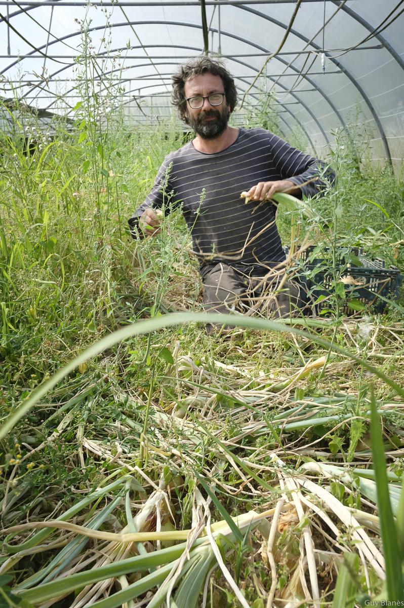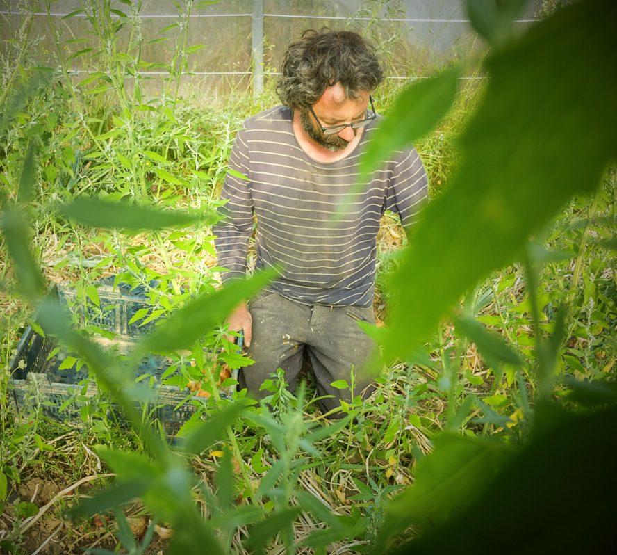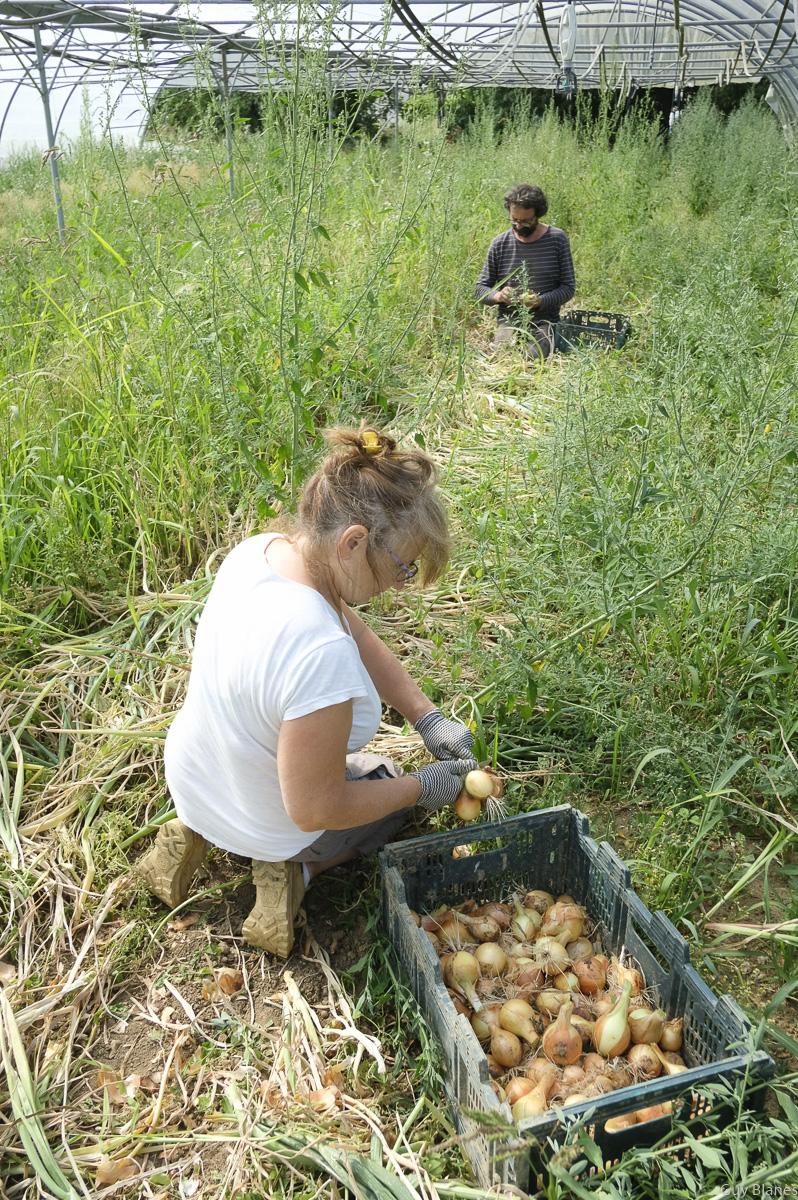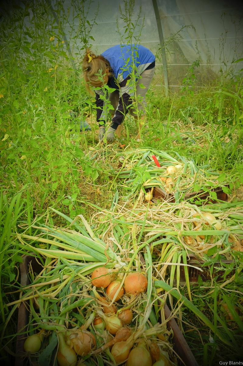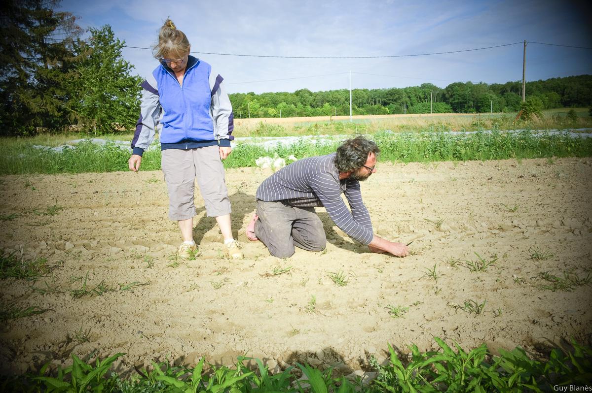 Ramassage d’oignons sous serre avant qu’il ne fasse trop chaud et puis désherbage de rang autour de toutes jeunes pousses de panais : un travail fin mais que nous n’avons pas fait à genoux par terre mais allongés sur une machine électrique, à l’abri du soleil., à contrario de la dernière photo. Benoit nous apprend à distinguer les jeunes pousses de panais des autres herbes à enlever…